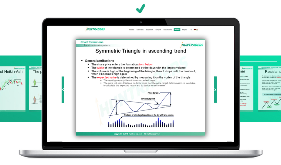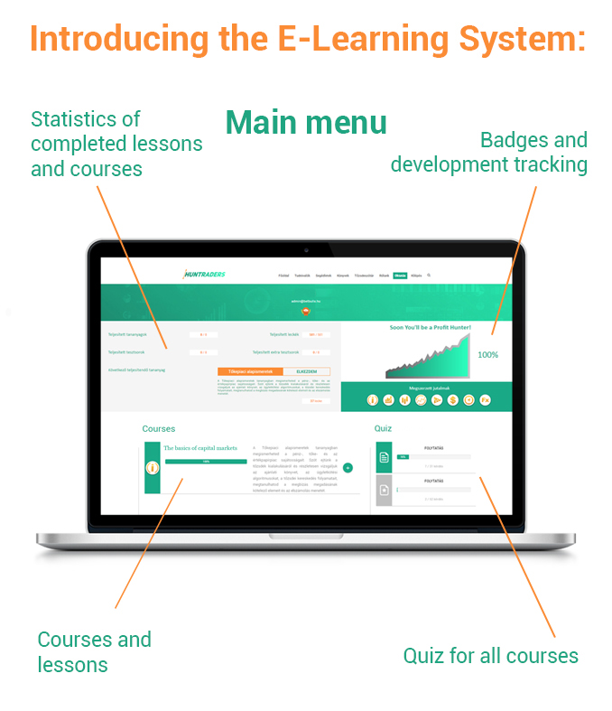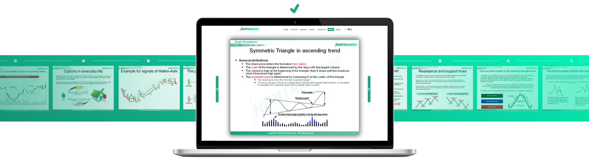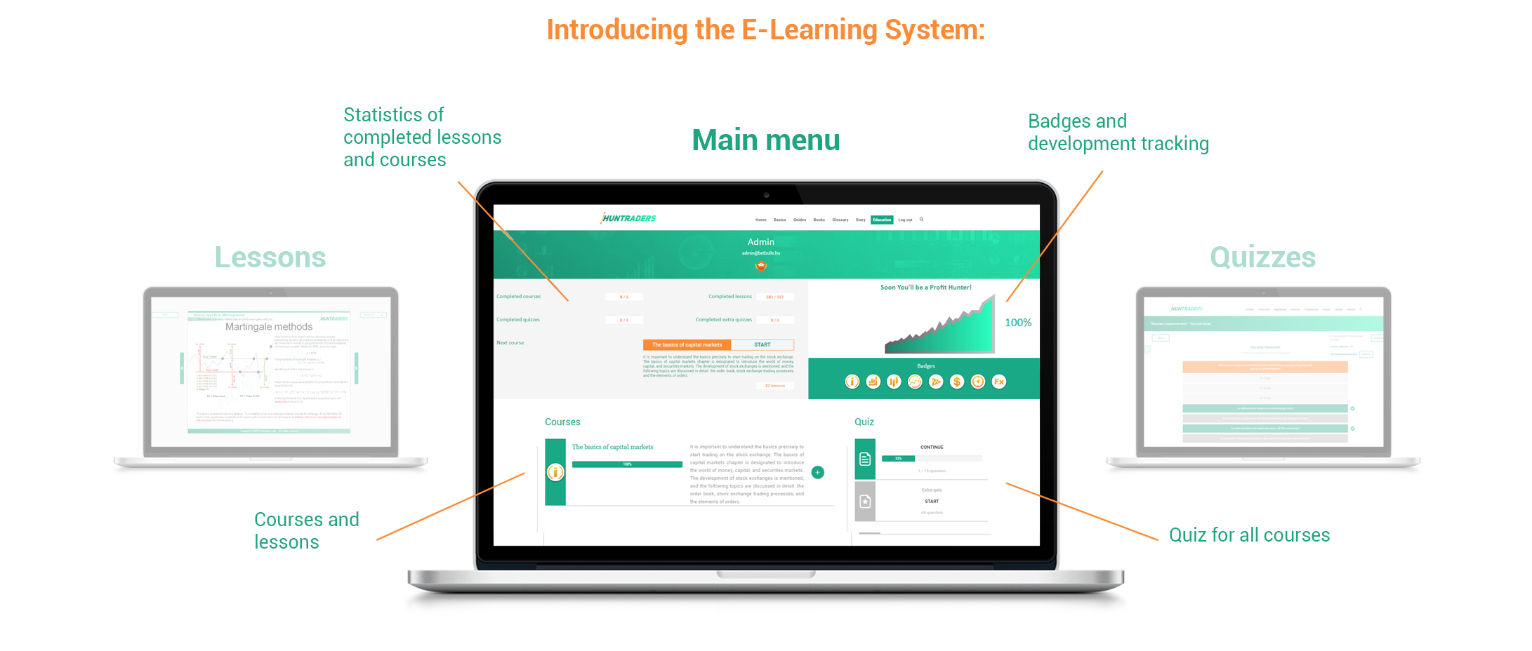 Huntraders’ Experts have developed a perfect trading education system to help beginner and advanced traders to gain the necessary knowledge from the basics to the top of technical analysis. So far 9 complete stock market courses, 1,700 slides and 630 quiz questions are at Your disposal within the e-learning system, 100% in English.